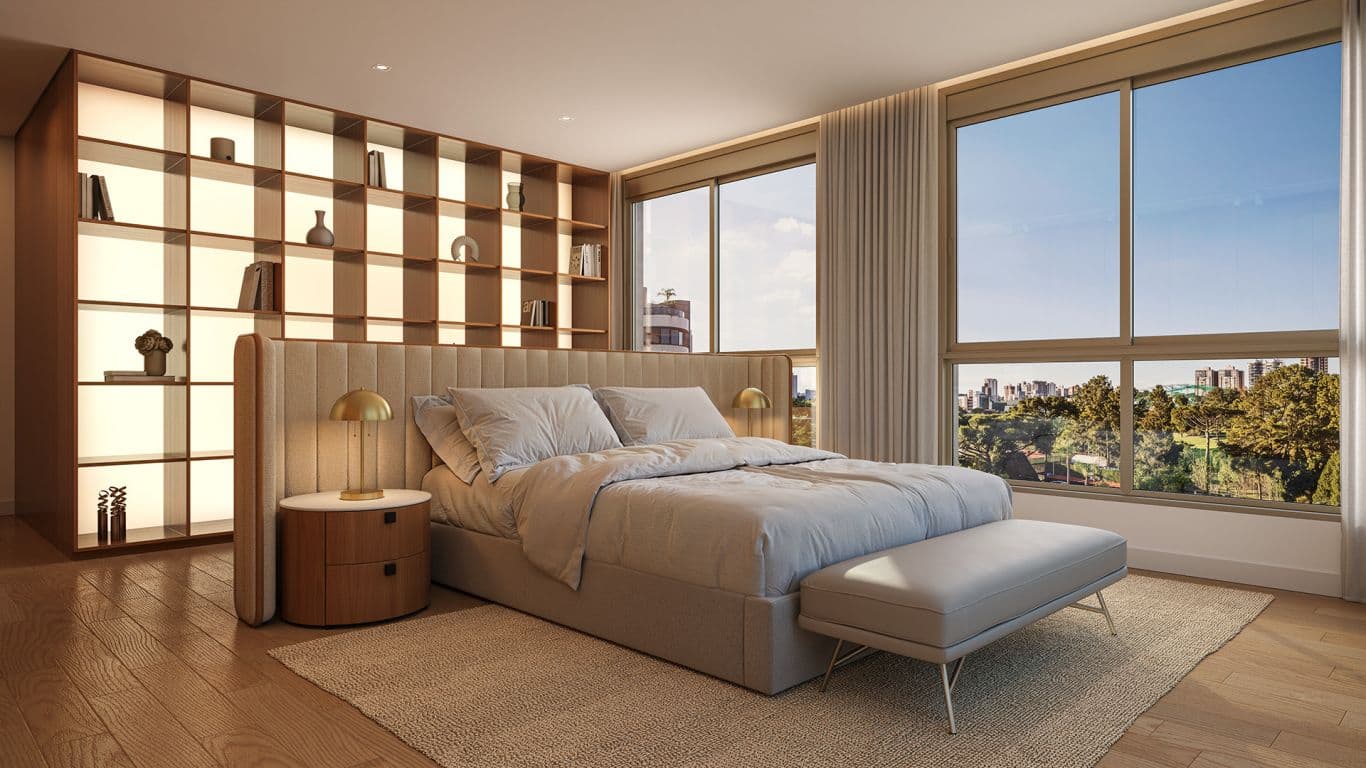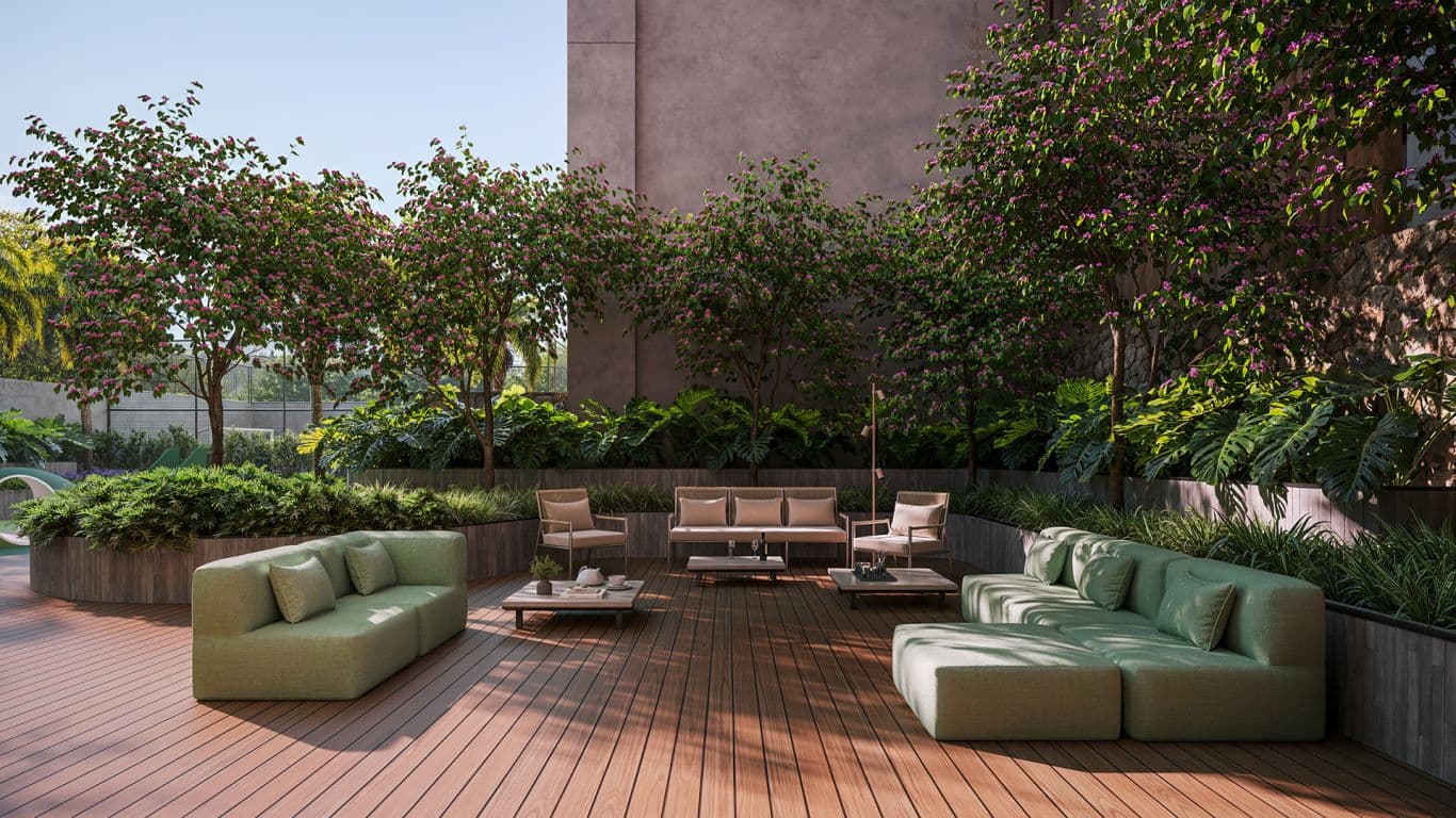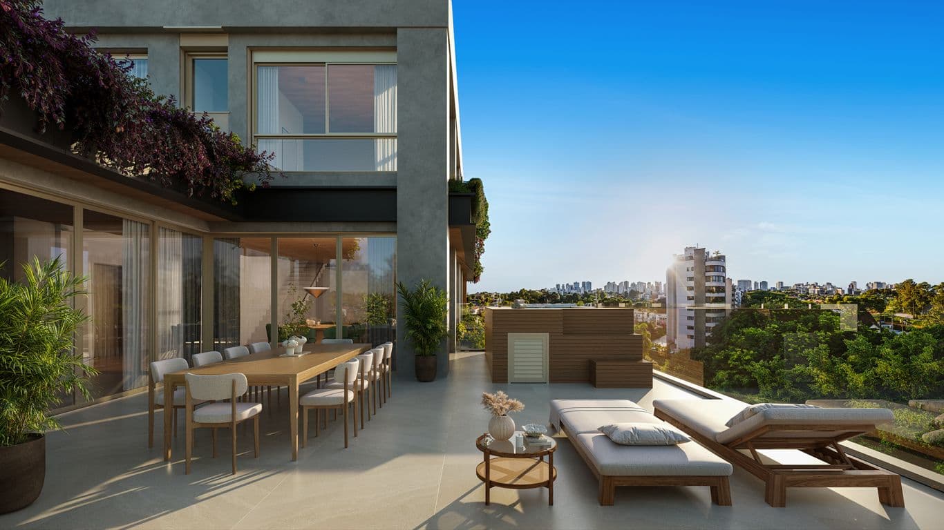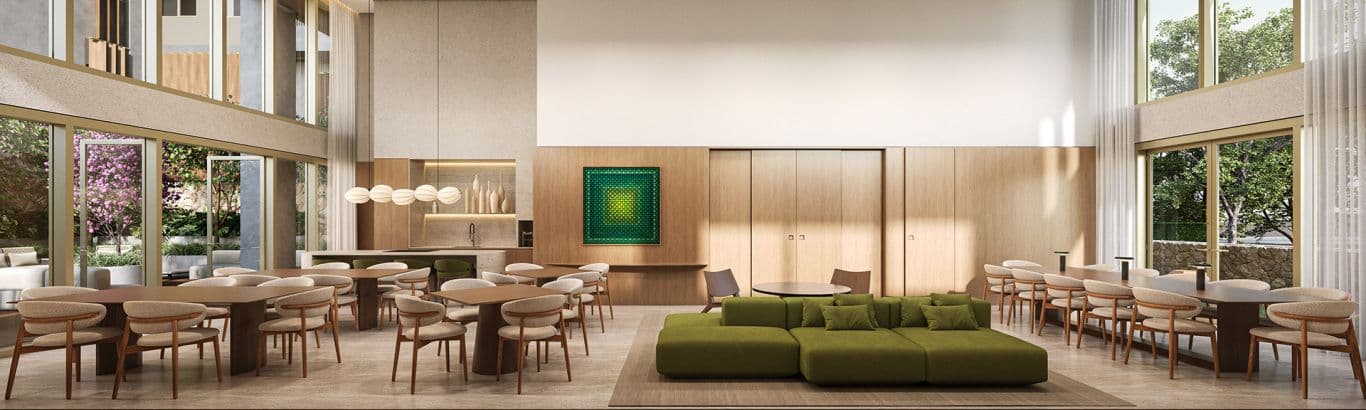 - Com fachada estruturada em um grid que combina ritmo, leveza e proporção, o edifício aposta em varandas amplas, brises metálicos em tom madeira e jardineiras integradas à composição, reforçando a relação com o entorno e com a vegetação local.
